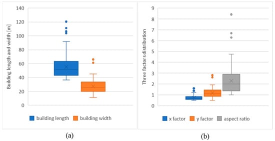 Parameter distribution of 119 HotelOffice buildings: (a) the building length and width distribution; (b) the x factor, y factor, and aspect ratio distribution.