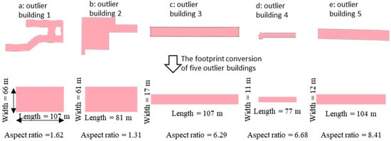 There are five extreme outliers in Figure 12b. To better understand the characteristics of the outliers, the five outliers’ length, width, and aspect ratio are presented in Figure 13. The upper footprints of the five buildings in Figure 13 are the actual building footprints, and the lower building footprints are the footprints after conversion. The conversion process is shown in Figure 3. Buildings c, d, and e have a relatively large aspect ratio and are within our screening criteria (length ≥ 35 m and width ≥ 10 m); therefore, they are shown as outliers in Figure 12b.