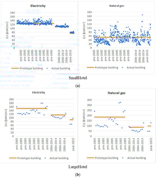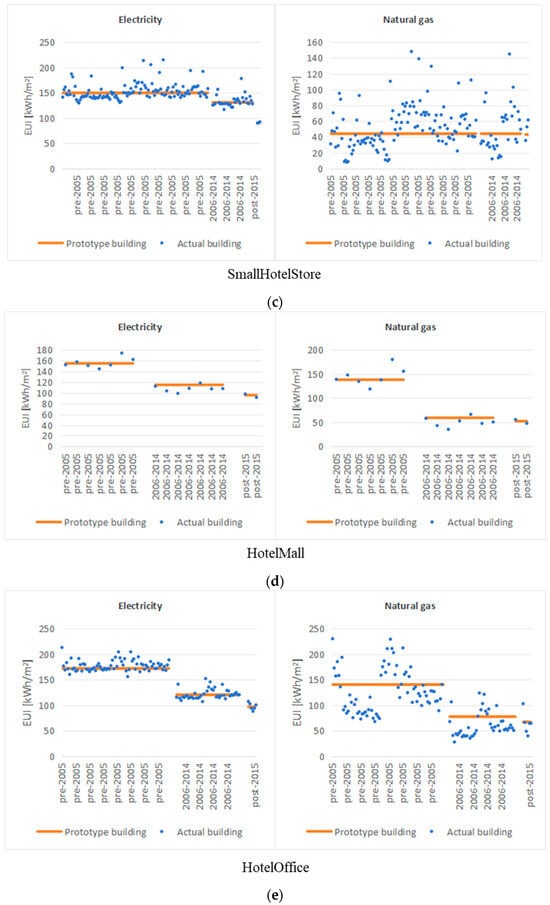 Figure 15a–e shows the three vintages’ electricity and natural gas EUIs for five hotel-related building types. Because only two buildings belong to the HotelOfficeMall building type after filtering, the electrical and natural gas EUI of the two buildings are listed in Table 8.