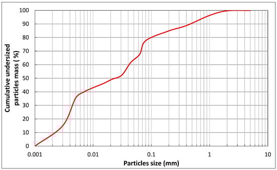 The raw earth studied comes from the region of Seraidi, Annaba, north-eastern Algeria. This soil was used historically for the construction of adobes. It is a fine-grained clay-sandy soil. The characteristics of the raw earth used and the particle size curve are represented, respectively, in Table 1 and Figure 1. The experimental tests were carried out at the laboratory level (LMGE-Annaba) following the methodology outlined by Bekkouche, S.R et al. [].