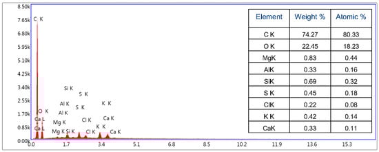 This study relates only to the fibers extracted from the leaflets of the date palm trees. The date palm fibers tested originate from the Biskra region (Algeria). The date palm leaflets were dried in the air under the sun then washed with plenty of tap water to remove dust, then they were dried in the oven. Their ends were cut and the remains were shredded to have more or less uniform long fibers. The cutting of the fibers was performed in a shredder with parallel cut knives. The length of the fiber depended on the shredding speed (adjustable) [,] (Figure 4). Energy-dispersive spectrometry (EDS) coupled to SEM is illustrated in Figure 5. Fiber characteristics are summarized in Table 3.