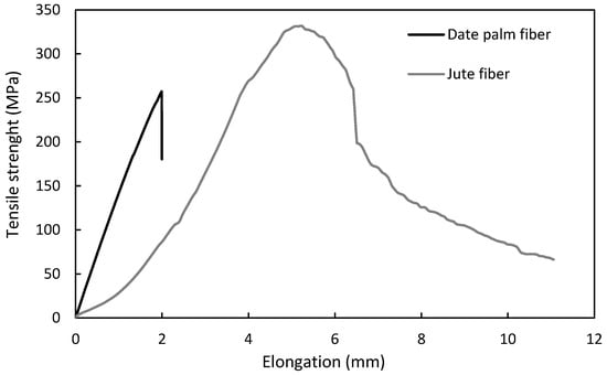 Figure 7 depicts the stress–elongation curve derived from direct tensile testing conducted on individual date palm and jute fibers. The results indicate that date palm fibers exhibit a linear elastic response, characterized by a maximum breaking stress of 263 MPa and a corresponding elongation of 2.37%. These fibers demonstrate an elastic modulus of 130 GPa, indicative of brittle fracture behavior. Conversely, jute fibers, composed of microfibrils, display a ductile response, owing to the sequential breakage of microfibrils under increasing tensile loads. Jute fibers exhibit a tensile strength of 345 MPa, an elastic modulus of 70 GPa, and a unit elongation at break of 8.55%.