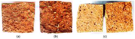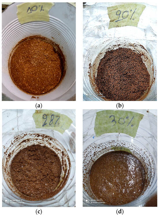 Three extreme changes are distinguished in the development of the various composites: at 10% and 12% resin: a dry mix; the adhesion between the constituents of the composite is insufficient, and the mixes are difficult to handle and friable (Figure 8a). From 20 to 28% resin: the workability of the mixtures is increasingly improved, and the adhesion between the constituents of the composite is highlighted in the fresh state (Figure 8a,b). Nevertheless, a liquid paste was obtained, indicating oversaturation of the earth at the rate of 30% resin (Figure 8c).