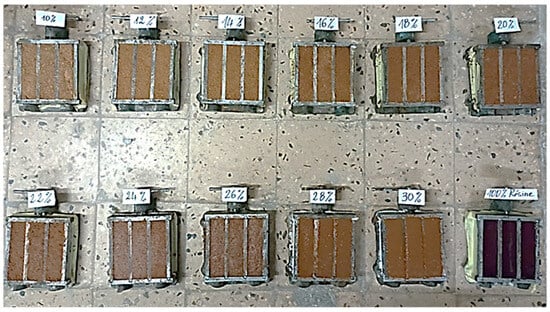 Before proceeding with the fabrication of the composites, preliminary steps are necessary. The constituent materials are stored under favorable conditions. The earth is dried at 60 °C for 48 h []. The polyester resin and the hardener are stored in a temperature-controlled conservator. The manufacture of the specimens is carried out according to a process beginning with the preparation of the binder: a mixture of the polyester resin and the hardener, whose dosage is adjusted to the percentage of resin; it is set at 2.4% according to the study by Mirouzi et al. []. It consists of mixing the earth with an optimal water content determined by the proctor test by the prepared binder. The mixture is mixed for 3 min to avoid sudden crystallization. The filling of the mixtures in metal molds is carried out in 3 layers by vibration for 2 min. The samples are stripped after drying in the surrounding area under laboratory conditions at temperature T = 25 °C and relative humidity RH = 50%) for 24 h (Figure 9).