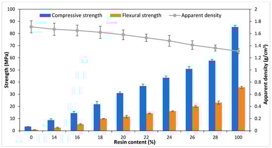 Influence of resin content on density, compressive strength and flexural strength of the composites studied.