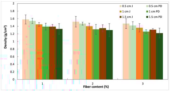 Figure 12 shows the results of the variation in the density of the composites as a function of the lengths and contents of plant fibers used. It is observed that the density of composites reinforced with date palm fibers is generally lower than that of composites reinforced with jute fibers. This converges with the porous state of these date palm fiber composites. This porosity can be attributed to the rigidity of the date palm fiber, which can entrain air in the matrix during the mixing of the material in the fresh state. The jute fiber being soft and flexible does not prevent good mixing and compaction of the composite. This reduces the porosity by increasing the density.