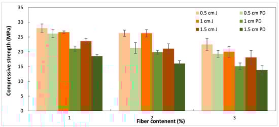 Influence of fiber content and length on the compressive strength of the composites studied.