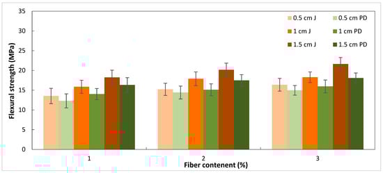 Figure 14 illustrates the results of the three-point bending tests of the composites as a function of the lengths and the fiber contents used. At a fiber content of 1% and for a length of 0.5 cm, the stress is reduced from 12.08 MPa for the composite reinforced with jute fibers to 11.01 MPa for that reinforced with palm fibers. This trend continues when increasing the length to 1.5 cm and the fiber content to 3%, where the stresses increase from 24.31 to 20.87 MPa for the jute and palm-fiber-reinforced composites, respectively. These observations reveal that the 1.5 cm lengths promote increased bonding within the material, resulting in higher levels of tensile bending stress.