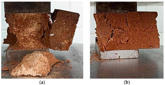 Figure 15a (unfibered composite) reveals the presence of cracks that progressively widen with increasing applied load, extending at a 45° angle throughout the full height of the specimen. This failure mechanism exhibits inherent brittleness, characterized by the absence of discernible plastic deformation. Nevertheless, fiber composites exhibit a failure mode characterized by the formation of vertical or interlaminar cracks, as illustrated in Figure 15b. In contrast to non-fibered composites, they demonstrate a more ductile response when subjected to compressive loading conditions. This enhanced ductility can be attributed to the plant fibers’ capacity to inhibit crack formation and promote plastic deformation within the material.