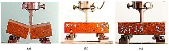 The failure modes observed during the bending tests (Figure 16) affirm the positive influence of fibers in general, and more specifically, jute fibers. In the case of the non-fiber composite, a brittle fracture occurs, resulting in the separation of the two halves of the tested specimen (Figure 16a). Conversely, a ductile fracture characterized by cracking without the separation of the two broken specimen parts is evident (Figure 16a,b). The extent of crack propagation is notably reduced in composites reinforced with jute fibers compared to those reinforced with date palm fibers.