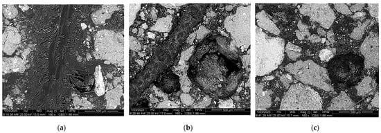 The images obtained through scanning electron microscopy (SEM), as depicted in Figure 18, substantiate the observations concerning facies fractures. Figure 18a clearly demonstrates that composites reinforced with jute fibers are characterized by flawless adhesion between the fibers and the matrix, facilitated by the presence of microfibrils within the jute fibers. Additionally, Figure 18b highlights a relatively feeble bond at the interface between the earth–resin composite matrix and the date palm fibers, attributable to the smooth surface of the latter. It is worth emphasizing that the impression of the sand particles on the unfibered composite is distinctly recognizable (Figure 18c).