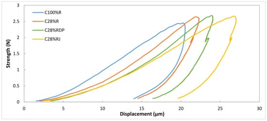 Fingerprint data obtained from the indentation test of the composites: (a) unfibered composite C100%R, (b) unfibered composite C100%R, (c) fibered composite C28%RJ and (d) fibered composite C28%RDP.