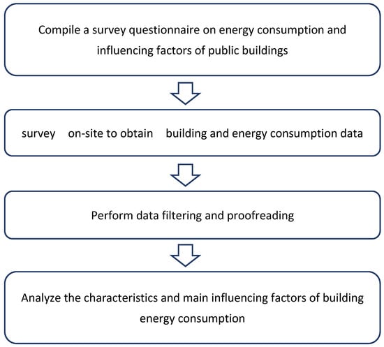 The research conceptual framework is shown in Figure 1. Firstly, a survey questionnaire on energy consumption and influencing factors in public buildings was completed. Secondly, the survey was carried out on-site to obtain building and energy consumption data. Thirdly, data filtering and proofreading were performed. Lastly, the characteristics of the main influencing factors in building energy consumption were analyzed.