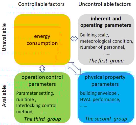 The influencing factors on building energy performance are classified into three groups according to whether users can control and utilize them to improve the operating efficiency of buildings. They include inherent and operating parameters, physical property parameters, and operation control parameters. If the factors can be changed to improve the energy efficiency of buildings without impacting building functions during construction or operation, they are defined as available. The factors that can be changed by occupants during building operations are classified as controllable. If the factors can be changed only during the construction stage of buildings, they are defined as uncontrollable. The relationships between building energy consumption and various influencing factors are shown in Figure 2. The first group of factors is defined as the inherent operating parameters related to building functions. The factors in the first group are uncontrollable and unavailable to improve the operating energy efficiency of buildings, which include factors such as building scale, climate, and occupancy. The second group of factors consists of the physical characteristic parameters of the building structure and air-conditioning systems, which are uncontrollable and available to improve the operating efficiency of buildings. Factors that can be controlled and available to improve building operating efficiency are related to the operating parameters of building energy use, which are classified as the third group. Overall, the first and second groups of factors can be classified into the uncontrollable category. It is noted that the available category covers the second and third groups of factors, which can be changed during building construction or operation by occupants to improve building energy performance.