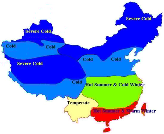 The climate zones in China are determined according to the current national standard, ‘Code for Thermal Design of Civil Buildings’ (GB 50176) []. It is mainly divided into five climate zones as shown in Figure 3, including severe cold regions, cold regions, hot summer and cold winter regions, hot summer and warm winter regions, and temperate regions.