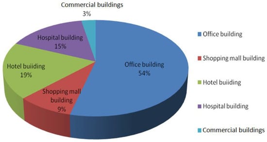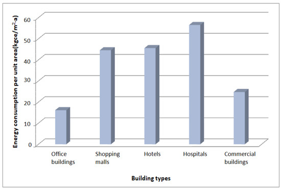 From Figure 6, it can be observed that hospitals, hotels, and shopping malls showed higher energy consumption than office and commercial buildings. It is necessary to take effective action to enhance their energy efficiency. Compared with these three types of high energy-consuming buildings, the total area of office buildings is larger. Because of the relatively large total building area, it is also important to improve the energy efficiency of office buildings.