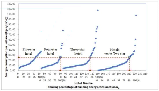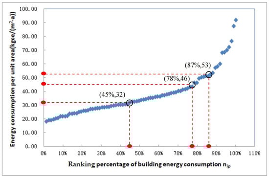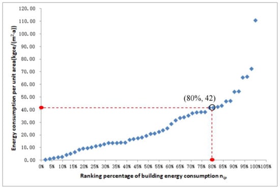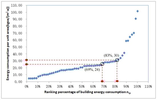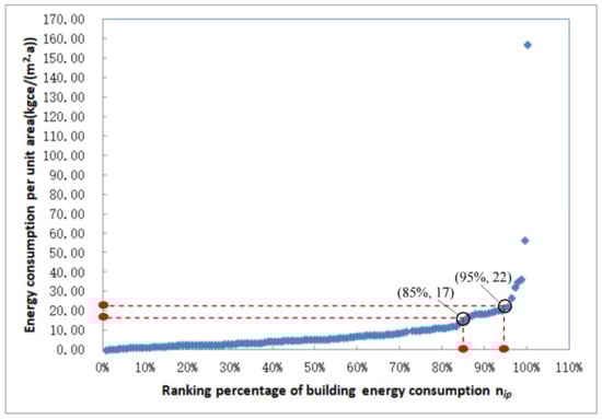 For a certain type of building, all buildings were first ranked based on the average annual energy consumption per square meter in ascending order and were numbered as Ni from 1 to Nmax. Nmax is the building number with the highest energy consumption. The percentage ranking number Nip was used to describe the energy performance ranking of the buildings, which was calculated as a percentage of the ratio of Ni to Nmax.