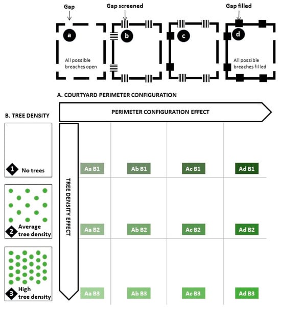 Figure 5 shows the selected scenarios, where Aa-d maintain the same tree density (i.e., average B2) but it changes the building perimeter configuration: