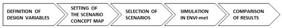 The process (Figure 2) is considered validated by comparing the simulated scenario 0 with onsite measurements for calibration purposes. This has been already investigated by the authors in previous studies where ENVI-met results’ consistency and reliability with real data were demonstrated with reference to the calibration of outdoor microclimate simulation models [77].
