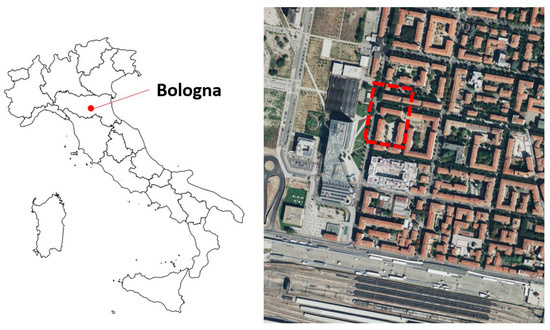 The site is located in the city of Bologna (Italy), 44° 49′ N latitude, 11° 34′ E longitude and 50 m a.s.l. altitude. According to the Köppen–Geiger classification [79], the area falls within a humid subtropical climate (Cfa) with short dry summers and heavy precipitation during mild winters. The city is in the Italian climatic ‘zone E’, where the number of degree days (DDs) is estimated between 2101 and 3000.