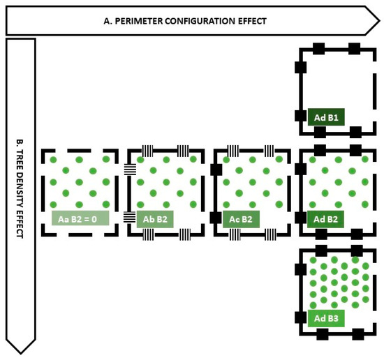 Two gaps are left open in all the cases, as they are mandatory access for the courtyard. With reference to tree density, three conditions with all possible gaps filled (Ad) are simulated beside the current state (in this case, scenario 0 corresponds to Aa B2), which is taken as a means of comparison. Scenarios Ad B1–3 in fact consider the building perimeter as totally closed to evaluate the contribution of vegetation alone: