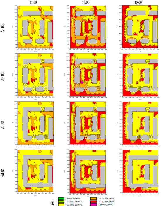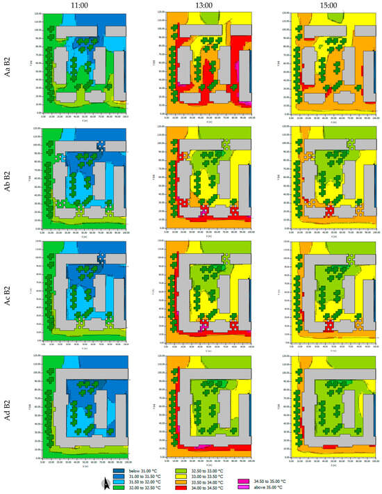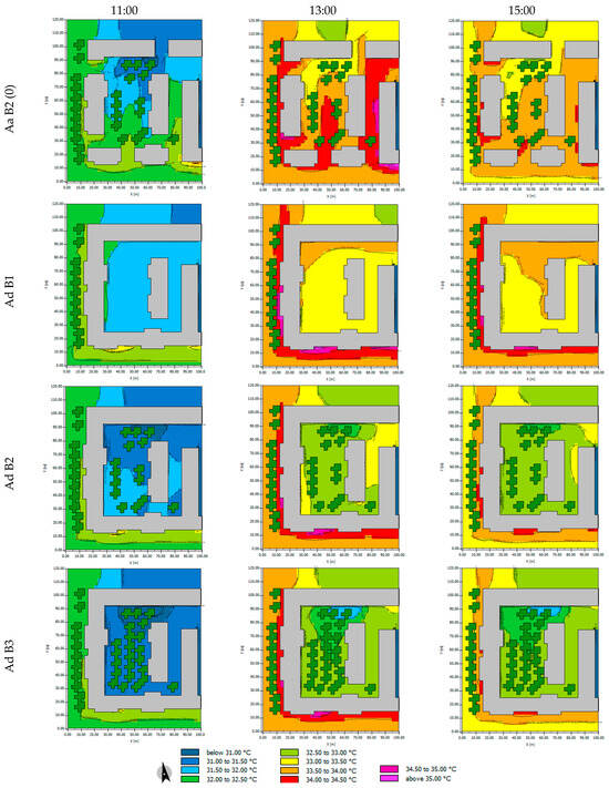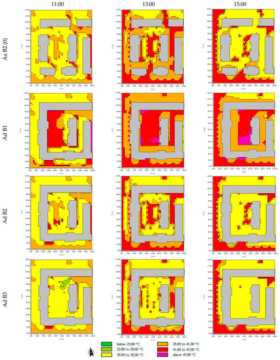 At 13:00 (Figure 6, second column) the same homogeneous temperature distribution occurs, but one degree higher (32.5 °C and 33.5 °C), except for scenario Ad B2, where the temperature of the whole yard is 32.5 °C (green). Scenario Aa shows a greater variation in the air temperature of the courtyard, with values between 33 °C and 34 °C (red). At 15:00 (Figure 6, third column), the distribution is similar to that of 13:00, both in terms of distribution and values, except for the current state, which shows temperature lower by 0.5 °C.