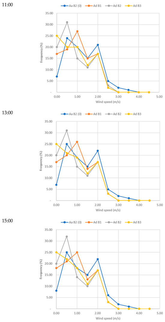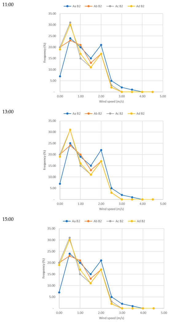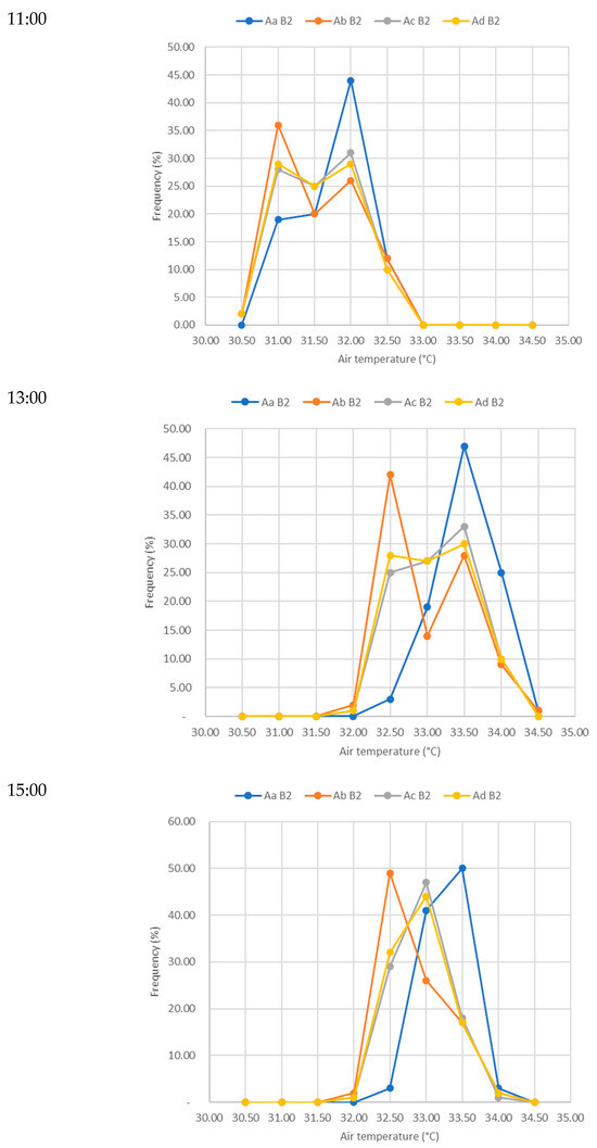 Figure 7 shows the frequency of each thermal comfort variable value in scenarios for the design variable A. The air temperature graphs show that at 11:00, the range is mostly between 30.5 °C and 32.5 °C, while at 13:00 and 15:00, the range is between 32 °C and 34.5°C. In all graphs, the current scenario (Aa B2, blue line) shows the highest frequency of highest temperature values: at 11:00 45% of the area is at 32 °C, at 13:00 48% is at 33.5 °C and at 15:00 over 50% of the area is at 33.5 °C. The other scenarios have lower values, both in terms of peaks and of the range of the distribution: in fact, the frequency of the values is evenly distributed, except for scenario Ab B2, which has a higher frequency (peak) of lower values by approximately 1 °C compared to the others: at 11:00, 35% of the area is at 31 °C, at 13:00, 42% is at 32.5 °C and at 3, at least 50% of the area is at 32.5 °C. The other two scenarios have similar and homogeneous distribution. Surprisingly, the ‘all possible gaps filled’ scenario (Ad B2) is not the one with the largest area with lower temperature values.