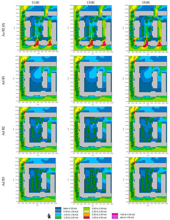 The first set of OMMs show how volume positioning and the diverse combinations of filled and screened gaps affect outdoor thermal comfort. Regarding the air temperature at 11:00 (Figure 6, first column), values in the courtyard are between 31.5 °C (dark blue) and 32 °C (light blue), almost evenly distributed in scenarios Ab B2 and Ac B2, while in the current state (scenario Aa B2), there are areas with temperatures slightly higher: 32.5 °C and 33 °C (green).