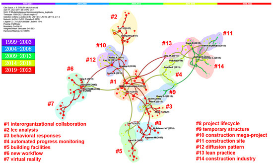 A total of thirteen primary clusters were formed in the field of BIM-management research (Figure A5). The earliest cluster (#5) was formed during the period between 2009 and 2013; it focuses on construction engineering and is represented by works such as Eastman C (2008) and Eastman et al. (2011) [63]. Then, in the next five years, four clusters (#3, #11, #12, and #13) came into being; among them, the largest cluster was #13. In this cluster, great attention is given to stakeholder expectations, and Bryde et al. (2013), which discusses the benefits that BIM can bring to construction projects, is the most cited work [42]. Most clusters were formed between 2019 and 2023: clusters #1, #2, #4, #6, #7, #8, #9, and #10. Among them, cluster #1 was the largest cluster formed during the study period. The cluster focuses on digital twins; Tang et al. (2019) contributed the most cited paper, which provides a detailed study of the integration of BIM and the Internet of Things (IoT), and the paper from Dave and Li et al. received the second most citations [10,46,64]. As the latest emerging clusters, clusters #9 and #10 mainly focused on organizational capabilities and augmented reality, respectively.