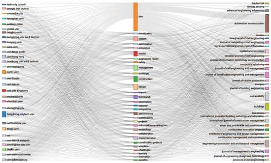 Figure 5 (Figure A7, Figure A8 and Figure A9) depicts a hybrid network of BIM’s application lifecycle research. In terms of the number of published articles, the institutions and journals ranking in the top 30 are represented by the squares on the left and right, respectively. The 30 squares in the center of Figure 5 (Figure A7, Figure A8 and Figure A9) represent the 30 most frequently occurring keywords.