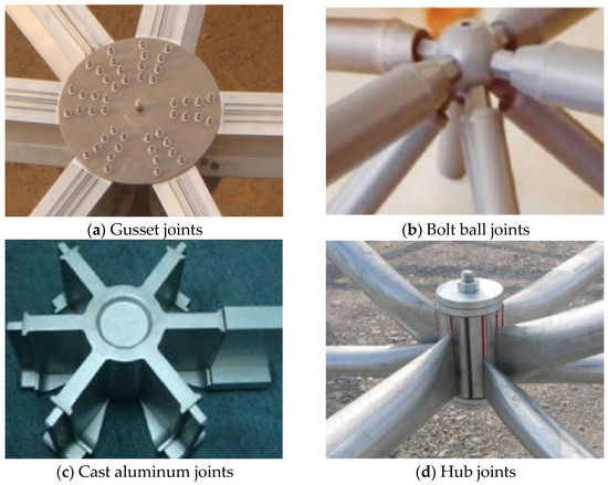 The commonly used types of joints in aluminum alloy spatial structures include gusset joints, bolt ball joints, cast aluminum joints, and hub joints, as shown in Figure 1. So far, some researchers have conducted a series of studies on these aluminum alloy joints and achieved excellent results.