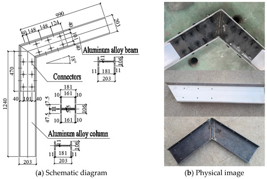 To explore the mechanical properties of aluminum alloy portal frame beam-column joints, in this section, beam-column joint specimens are designed as shown in Figure 2. The beam-column joint specimens are made of H-shaped aluminum alloy members and double C-shaped double groove connectors tightly connected by bolts. Among them, the cross-sectional size of the aluminum alloy I-beam is H203 × 106 × 11 × 11 mm, and the channel steel connection is C181 × 47.5 × 5 × 10 mm. Six and four bolt holes are, respectively, set on the upper and lower flanges of the H-shaped aluminum alloy I-beam, and six bolt holes are set on the web of the I-beam. At the same time, bolt holes are set at the corresponding positions of the flange and web of the double groove connector. The diameter of the bolt holes is determined based on the corresponding bolt diameter (greater than 0.2 mm of the bolt diameter). The lengths of aluminum alloy I-beams are 1240 mm and 990 mm, respectively, and the lengths of channel steel connectors are 470 mm. The distribution spacing of bolts on the flange and web is 148 mm. The structural dimensions of the specimens are shown in Figure 2a. The aluminum alloy I-beams are cut and drilled in the factory, and the double groove connectors are welded from steel plates. The two are then transported to the laboratory for assembly and connection, as shown in Figure 2b.