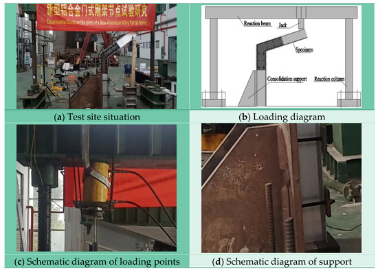 The loading site of this experiment is shown in Figure 3a. The experimental system mainly includes reaction frame (composed of reaction beam and column), jack, consolidation support, loading control instrument, and data acquisition instrument. During the experiment, the lower end of the specimen is first tightly connected to the consolidation support, and then, a vertical concentrated force is applied to the specimen through a jack, as shown in Figure 3b. Four bolts and end plates are used to securely connect the jack to the reaction beam, ensuring that the position of the loading point does not shift during the loading process, as shown in Figure 3c. The consolidation support is tightly connected to the foundation through vertically arranged threaded steel bars, while the bottom of the specimen is tightly connected to the consolidation support through three drainage flat bolts, ensuring the formation of consolidation constraint boundary conditions at the bottom of the specimen, as shown in Figure 3d. By using the above loading methods and support forms, the boundary conditions of aluminum alloy portal frame beam-column joints under vertical load can be simulated, thereby ensuring the effectiveness of the test results. During the experiment, the loading control instrument was used to control the loading speed. In this experiment, the loading speed was 1 mm/min, and the data collection instrument was used to record the test data at each moment.