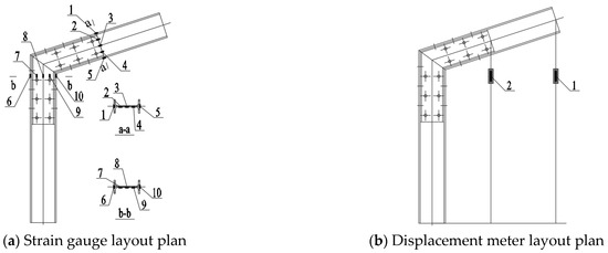 During the experiment, the strain and displacement data of the specimen at each moment are recorded using a data acquisition instrument, and the positions of each measuring point are shown in Figure 4. To obtain the strain variation pattern of H-type aluminum alloy beams and C-type channel steel connections under vertical load, a total of 10 sets of strain gauges were set at different parts of the cross-section, as shown in Figure 4a. Among them, strain gauges 1–5 are arranged on the cross-section of aluminum alloy beams, and gauges 6–10 are arranged on channel steel connectors. The No.1 strain gauge is arranged on the upper flange of the aluminum alloy beam, the 2nd, 3rd, and 4th are, respectively, arranged on the beam web from top to bottom, and the 5th is arranged on the lower flange of the aluminum alloy beam. Strain gauges 6 and 10 are, respectively, arranged on the upper and lower flanges on the left side of the channel steel connection, while gauges 7, 8, and 9 are evenly arranged on the web plate of the channel steel connection. The full cross-section strain changes in aluminum alloy beams and channel steel connections are monitored and recorded during the loading cycle using 10 strain gauges.