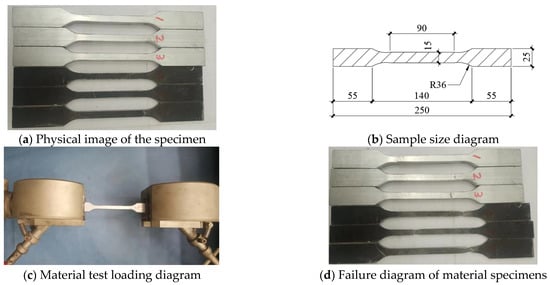 The H-shaped I-beam of the test piece is made of 6061-T6 [19,20] aluminum alloy profile, and the double groove connector is made of Q235 steel. Samples from the same batch of aluminum and steel used in the test components are obtained and processed into standard specimens for material properties testing [21], as shown in Figure 5a. The main length of the material test piece is 250 mm, with both ends being 55 mm and 25 mm in length and width, and the middle section being 90 mm and 15 mm in length and width, respectively. The two ends and middle section are transitioned through a circular arc with a radius of 36 mm. The dimensions of the test piece are shown in Figure 5b. The material testing tensile machine tightly clamps the two ends of the material test piece, and then begins to apply axial tension, as shown in Figure 5c. The failure mode of the specimens is shown in Figure 5d, and all of them show tensile failure of the middle section. The results of the material properties test are summarized in Table 2.