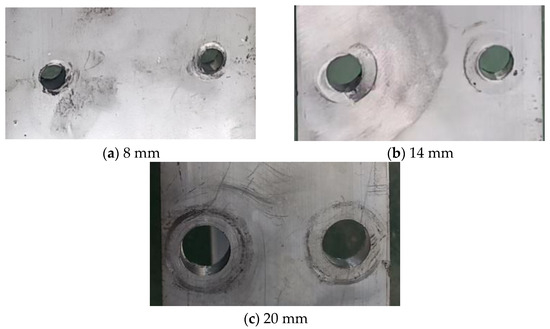 For beam-column joints with different bolt diameters, the failure state of the bolt hole wall needs to be focused on. Therefore, the bolts were removed after the specimen failed, and the state of the bolt hole wall is shown in Figure 6. When the bolt diameter is 8 mm, there is a significant extrusion deformation on the hole wall. When the bolt diameter is 14 mm, some bolt hole walls show slight compression deformation, while some hole walls show no significant compression. The bolt diameter increased to 20 mm, and the bolt hole walls remained intact without obvious signs of compression. From the above analysis, it can be seen that as the diameter of the bolt increases, the extrusion area of the bolt hole wall increases, and the extrusion deformation of the hole wall gradually decreases.