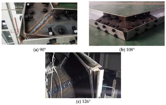 The failure modes of beam-column joint specimens with different arch angles are summarized in Figure 7. From this figure, it can be seen that the failure modes of the beam-column joint specimens are basically consistent at different arch angles. As the vertical load increases, the bending moment at the corner of the aluminum alloy portal frame beam-column joint gradually increases, causing buckling failure of the outer flange corner of the double groove connection, and is accompanied by an increase in the gap between the aluminum alloy beam flanges.