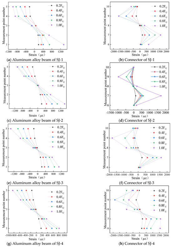 - The cross-sectional strain distribution of aluminum alloy beams and channel steel connectors of each specimen is basically consistent, which is due to the similar structural forms and consistent loading methods of each joint specimen;