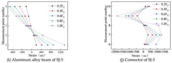 In order to investigate the variation law of the full section strain of aluminum alloy beams and double groove connectors during vertical load loading, the loading cycle was divided into five specimen joints, and the strain distribution status of each joint section was extracted, as shown in Figure 8. Observing the strain graph curves at various time points, the observations made are as follows: