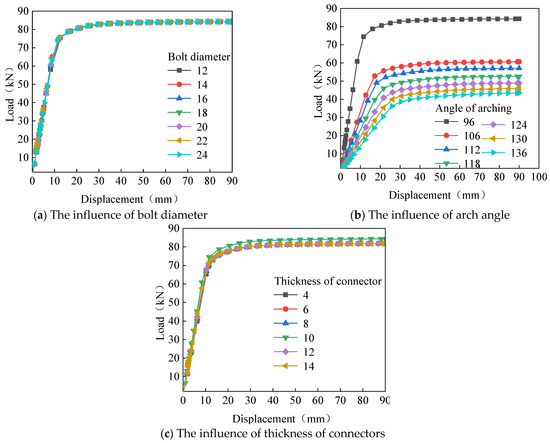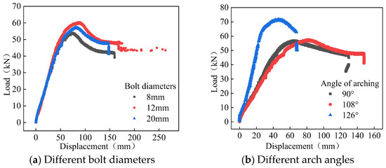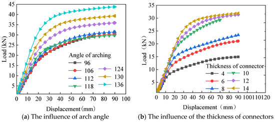 - According to the experiment, there is no significant difference in the load–displacement curve when the arch angle increases from 90 degrees to 108 degrees. When the arch angle increases to 126 degrees, the stiffness and ultimate bearing capacity of the joint under vertical load significantly increase.