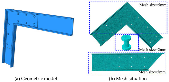 The division of finite element mesh directly determines the accuracy and speed of calculation. The mesh division of this model is shown in Figure 10b. According to the structural and stress characteristics of the beam-column joints, the grid density should be appropriately increased at the corners and bolt connections of the model, and relatively small grid densities can be used for grid division at other positions, but it should be ensured that no less than two segments of grid are divided along the thickness direction.