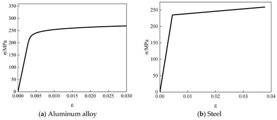 When conducting numerical simulations, the selection of material models will directly determine the effectiveness of the calculation results. In the numerical model of beams and columns, there are mainly two types of materials, namely, aluminum alloy and steel. Based on the results of material properties tests, the Ramberg–Osgood model was used for aluminum alloy [22,23], and the double-line model was used for steel, as shown in Figure 11.