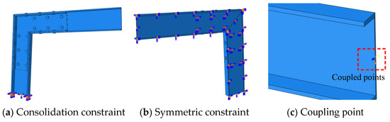According to the loading scheme and constraint conditions of the test specimen, the boundary conditions of this model mainly include three aspects, namely, fixed end constraints, symmetric constraints, and contact settings [24]. The fixed end constraint is consistent with the experiment, that is, a consolidation constraint is set at the bottom of the column component of the beam-column joint specimen to constrain the displacement and rotation of the column bottom, as shown in Figure 12a. According to the geometric symmetry of the joint specimen, symmetric constraints are set on the central section of the web, as shown in Figure 12b. Relative sliding occurs between different components of the specimen, so it is necessary to set up a “limited slip” contact. The bolt rod and bolt hole wall only need to be set up with a normal “hard contact”, while other contacts need to consider friction, that is, set a tangential “Coulomb friction” with a friction coefficient of 0.3. The coupling point is set at the center of the section at the loading end, which is used to apply the load, as shown in Figure 12c.
