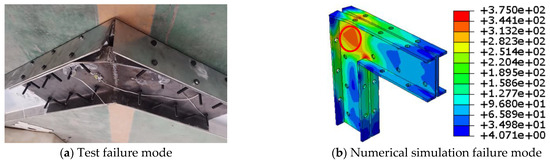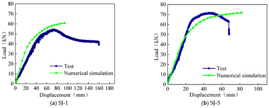 To verify the effectiveness of the numerical model, test specimens SJ-1 and SJ-5 were simulated, and the comparison of load–displacement curves is shown in Figure 13. From this figure, it can be seen that the load–displacement curves of the experiment and numerical simulation are relatively consistent, especially the variation law of the second type curve is basically consistent. The ultimate loads and displacements for experiments and numerical simulations are listed in Table 3. The comparison results show that the ultimate load error between the experiment and numerical simulation is only 4.77%, and the ultimate displacement error is only 4.01%. Obviously, this type of numerical model can be used for parameter analysis of aluminum alloy portal frame beam-column joints.