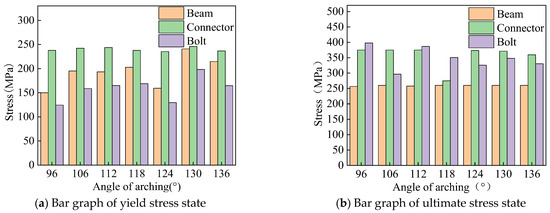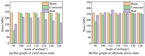 The yield and ultimate stress states of aluminum alloy portal frame beam-column joints under horizontal load at different arch angles are shown in Figure 19. As the arch angle increases, the stress of the H-shaped aluminum alloy beam remains unchanged during joint yielding and failure, the stress of the groove type connector increases first and then remains unchanged, and the stress of the bolts shows a trend of increasing first and then decreasing.