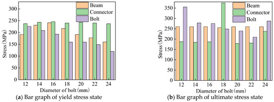 The yield and ultimate stress states of aluminum alloy portal frame beam-column joints under horizontal load with different bolt diameters are shown in Figure 18. There is no significant difference in the stress of H-type aluminum alloy rods at joint yield and ultimate state, while the stress of bolts at joint yield and ultimate state decreases with an increase in diameter. This is because an increase in bolt diameter will increase the stress area of the bolt, thereby significantly reducing its stress.
