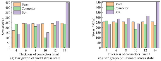When the wall thickness of the groove type connector changes, the yield and ultimate stress state changes in the aluminum alloy portal frame beam-column joints under horizontal load are shown in Figure 20. As the wall thickness of the groove connection increases, the stress of the H-type aluminum alloy beam at joint yield gradually increases, but the increase is relatively small. The stress of the groove type connector has no obvious change pattern, and the change amplitude is relatively large when the joint yields, while the change amplitude is relatively small when the joint fails. When the joint yields and fails, the stress of the bolt increases with an increase in the wall thickness of the groove connection, and its variation is significant.