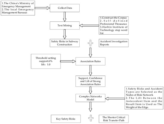 Based on the above literature review, it can be concluded that the current research on SCSR has the following shortcomings: Scholars have conducted more research on SCSR, but because they usually analyze the interrelationships of single risks, it is difficult to reflect the occurrence and development of SCSA. In addition, the previous identification of safety risks was mostly through literature analysis and expert discussion; the identification of safety risks has a lot of subjectivity. Therefore, this paper uses text mining to identify SCSR and employs association rules and complex network modeling to explore the subway construction risk transfer relationship.
