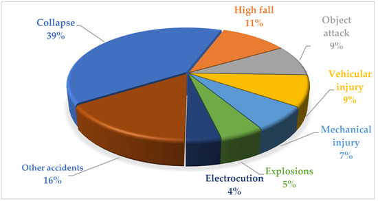 Accident analysis can identify the causes of accidents and the frequency and probability of accidents, as well as the path of accidents [56]. Further, analysis of the causes and path of accidents can be targeted to the construction of safety management systems and safety training [57]. Safety accident investigation reports can be used for accident analysis, as they contain detailed descriptions of the accident time, accident process, accident direct or indirect causes, and accident prevention measures. In this paper, 101 subway construction safety accident reports were collected from China’s Ministry of Emergency Management and local emergency management bureaus from 2000 to 2023, including 40 cases of collapse accidents, 11 cases of high fall accidents, 9 cases of object attack accidents, 9 cases of vehicular injury accidents, 7 cases of mechanical injury accidents, 5 cases of explosions, 4 cases of electrocution accidents, and 16 other cases of other accidents (drilling through tunnels, shield machine flooding, fire, poisoning, etc.). Statistics on the classification of accident reports are shown in Figure 2.