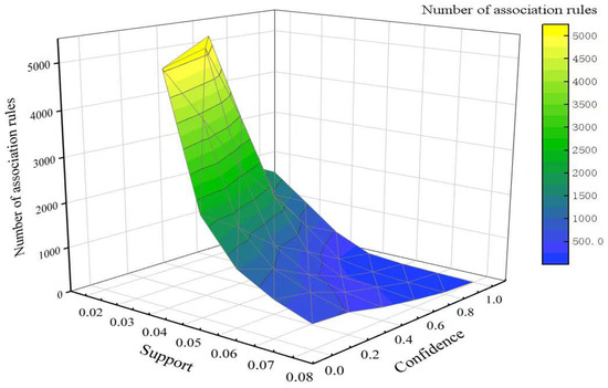In this paper, association rules are used to identify risk-transfer relationships in subway construction. The safety risks in each safety investigation report were treated as an itemset, and some of the data are shown in Table 2. According to the Apriori algorithm, if the threshold is set too low, a large number of irrelevant association rules will be generated, which will affect the calculation results. If the threshold is set too high, the data will have high reliability, but some useful association rules will be omitted. For the collected data, the number of association rules generated by the application of data mining at different parameter thresholds was statistically analyzed (see Figure 4). Therefore, in order to improve the reliability and credibility of the data, after expert discussion and analysis, the minimum support was set to 6% and the lift was set to 1.0. A total of 1258 strong association rules were mined. According to Formulas (1)–(3), some association rules are shown in Table 3.